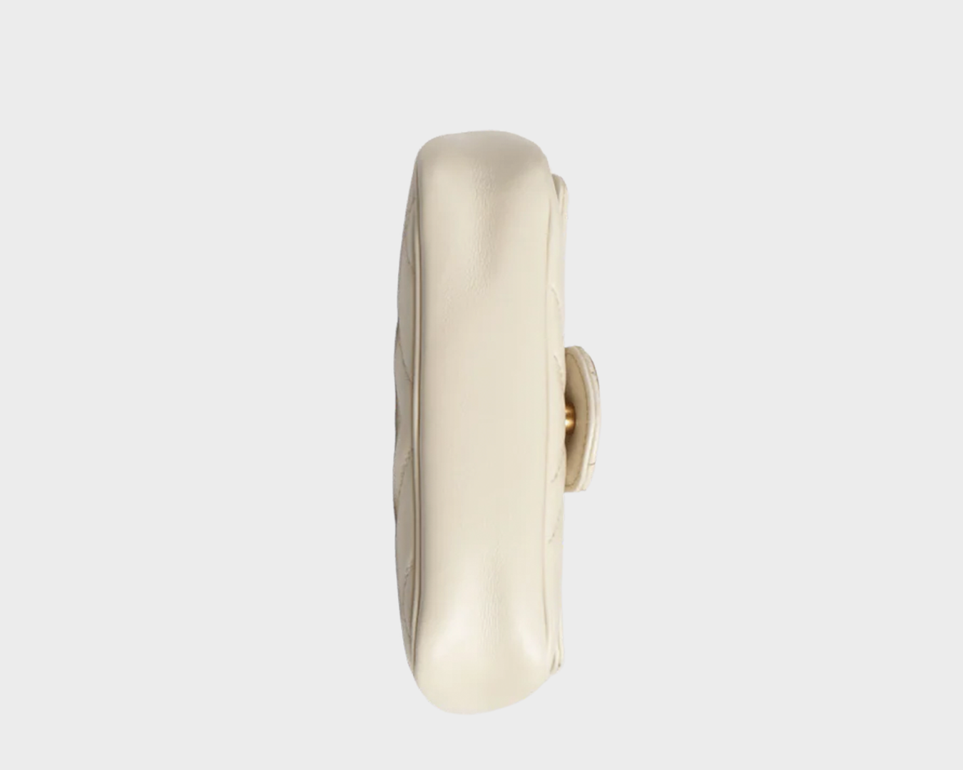 A versão mini da icônica Gucci Marmont, confeccionada na Itália, é a definição do luxo compacto. Feita em couro matelassê chevron off white, ela exibe o Duplo G, símbolo da herança Gucci dos anos 70, no fecho da aba frontal. Um delicado coração em relevo na parte posterior sela o design.